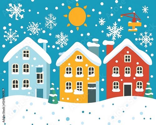snow, winter, house, building, sky, snowflake, sun, cold, weather, home, roof, window, chimney, landscape, illustration, art, blue, orange, red, white, yellow, door, season, snowdrift, fir, tree, day, outside, scene, background, graphic, flat, design, town, city, construction, crane, falling, bright, cartoon, cosy, neighbourhood, peaceful, simple, ground, element