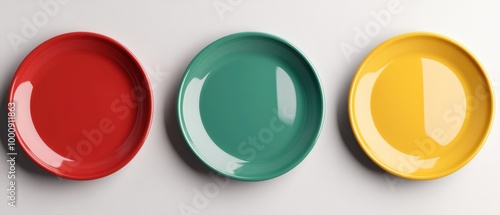 plate, red, green, yellow, ceramic, dish, tableware, kitchen, dining, food, dinner, table, still life, minimalism, simple, clean, modern, white, colours, bright, glossy, empty, round, decor, surface, topview, overhead, studio, isolated, lifestyle, home, interior