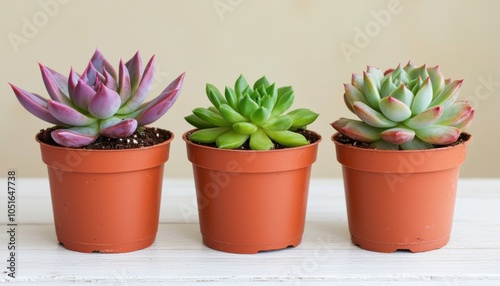 Three colorful succulent plants in terracotta pots on a wooden surface.