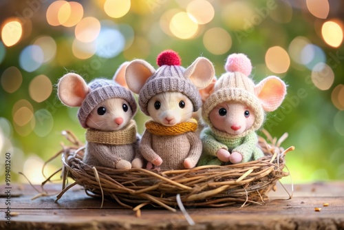Three Cute Mice Wearing Winter Hats in a Bird's Nest.