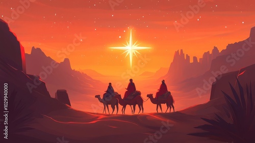 Three cute wise men riding camels through the desert under a glowing star, Reyes Magos theme with space for copy