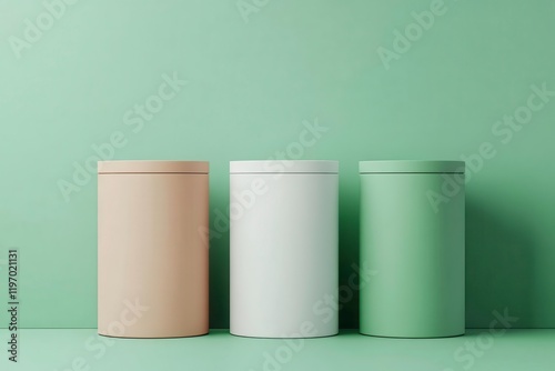 Three cylindrical containers in soft pastel colors (peach, white, mint) against a muted green background, creating a minimalist aesthetic.