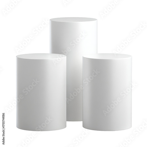 Three cylindrical white pedestals arranged in a visually striking composition for display purposes
