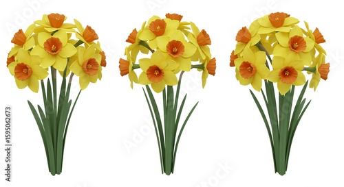 daffodil, flower, bouquet, yellow, orange, green, spring, floral, isolated, arrangement, nature, plant, floral arrangement, decorative, spring flower, display, closeup, colours, symmetry, bright, high-coloured, foliage, natural, background, white, isolated image, copy space, seasonal, graphic design, design element, vector, floral pattern, illustration, digital artwork