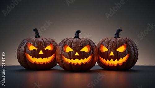 Three Dark Carved Pumpkins with Intense Orange Glow on Black