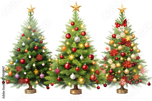 Three Decorated Christmas Trees with Ornaments and Stars on Transparent Background