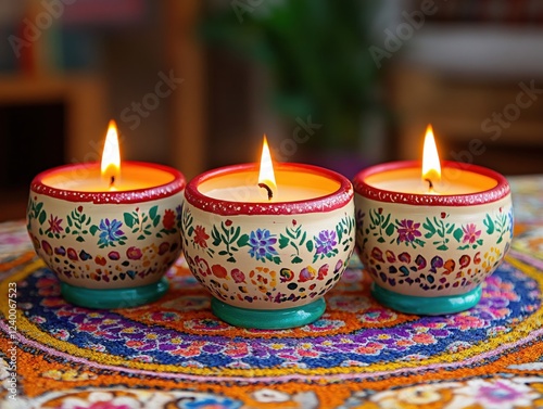 Three decorative candles flicker warmly on a colorful patterned cloth creating a cozy scene