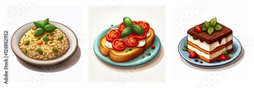 Three dishes: risotto with basil, bruschetta with tomatoes and basil, and tiramisu with chocolate and strawberries, all on plates.
