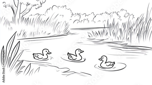duck, duck pond, water, swimming, nature, landscape, serene, calm, bird, wildlife, scenery, outdoors, rural, peaceful, tranquil, quiet, idylli, three, animal, avian, feathered, aquatic, lake, river, vegetation, grass, tree, bush, reed, bank, shoreline, ripple, vignetting, drawing, illustration, black, white, monochrome, simple, art