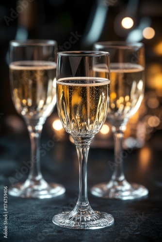 Three elegant champagne glasses filled with sparkling golden bubbles, exuding a festive atmosphere.