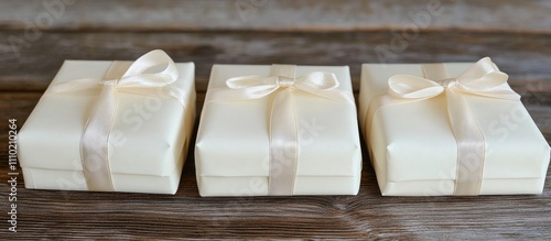 Three elegantly wrapped white gift boxes with satin ribbons on a rustic wooden background