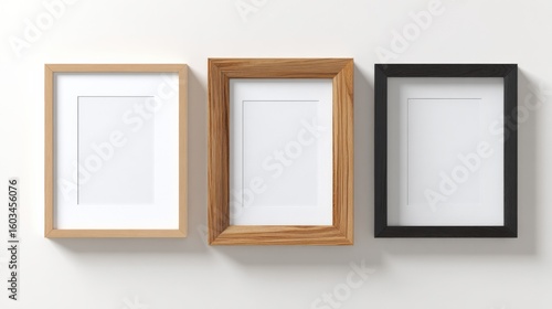 Three Empty Picture Frames Made of Different Materials in a Row on a White Wall with Space for Artwork or Photos