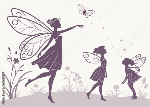 fairy, fairy, silhouette, winged, fantasy, magic, aethereal, delicate, whimsical, graceful, elegant, flying, dancing, nature, meadow, flower, floral, butterfly, star, illustration, drawing, graphic, design, vector, purple, light background, folklore, enchantment, sprite