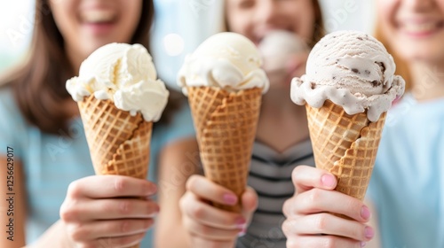 Three Friends Enjoy Waffle Ice Cream Cones, Sharing Smiles and Laughter on a Summer Day