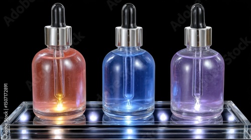 bottle, glasses, liquid, dropper, lit, display, red, blue, purple, transparent, shiny, black, cap, light, arrangement, row, glowing, aglow, elegant, sleek, design, modern, cosmetic, essential, oil, serum, skincare, beauty, container, decor, illuminated, shelf, clean, polished, neat, organised, colours, bright, high-coloured, contrast, minimalistic, stylish, trendy