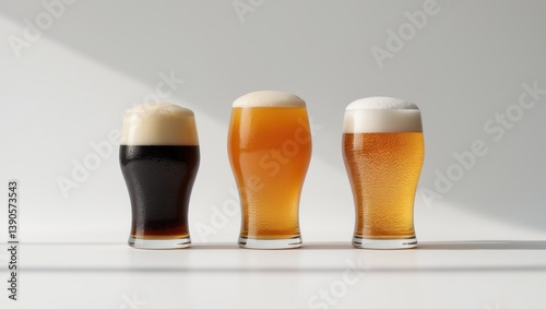 Three glasses of craft beer displayed on a white background.