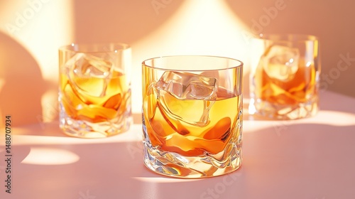 Three glasses of golden whiskey with ice cubes on pink background bar pub life cool drink light still