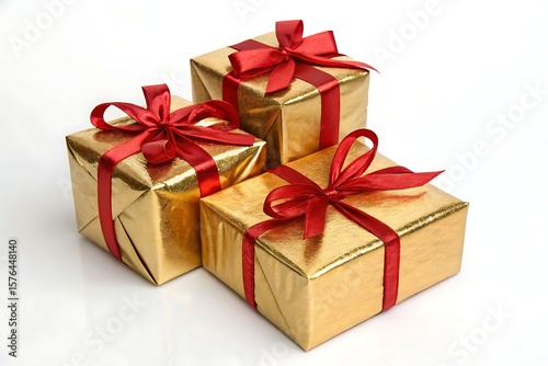 gift, present, box, gold, red, ribbon, bow, celebration, christmas, holiday, isolated, white background, surprise, wrapping, paper, gold, three, party, birthday, anniversary, february 14, new year, luxury, elegant, shiny, festive, giving, package, nobody, copy space, satin, foil, group, flocked, occasion, christmas, decoration