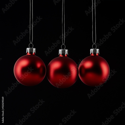 Three hanging red Christmas ornaments on a black background, a simple design, minimalistic, no shadows, front view,