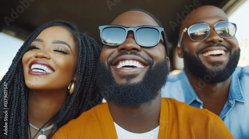 friends, happy, laughing, smiling, joyful, cheerful, black, african, american, man, woman, group, portrait, closeup, sunshine, summer, sunglasses, positive, togetherness, friendship, fun, carefree, happiness, bright, vibrant, optimistic, contentment, excitement, celebration, good, time, beautiful, attractive, stylish, cool, trendy, fashion, people, adult, lifestyle, oneness, connection, bond, energy, smile, teeth, eye, expression