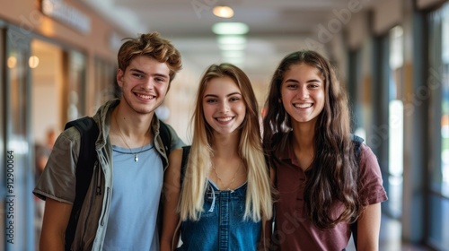 student, hallway, happy, smiling, young, friends, teenage, girl, boy, group, casual attire, backpack, college, university, education, school, positive, cheerful, friendly, together, portrait, indoor, light, bright, background, blurry, pose, standing, looking, camera, jean, shirt, sweater, style, youth, joy, fun, friendship