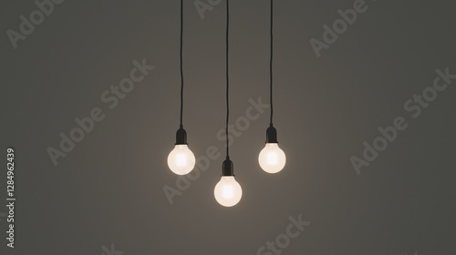 Three illuminated bulbs hanging against a gray backdrop; ideas, innovation concept
