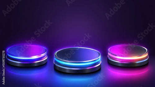 Three illuminated circular podiums with neon lights on dark background.