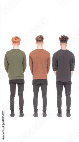 Three individuals stand side by side, showcasing different hairstyles and casual outfits from the back.