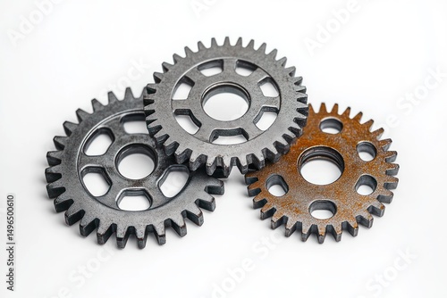 Three interlocked metal gears with one gear showing signs of rust on a white background symbolizing mechanical parts and industrial wear