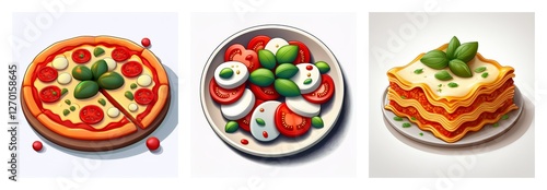 Three Italian dishes are presented: a pepperoni pizza slice, a fresh Caprese salad, and a portion of cheesy lasagna.