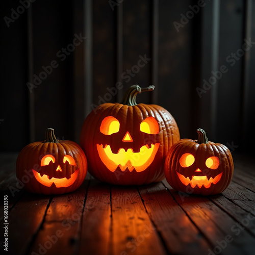 pumpkin, halloween, autumn, fall, glowing, carved, skittish, festive, celebration, orange, wood, dark, seasonal, holiday, decoration, traditional, scarey, night, table, surface, three, arrangement, closeup, still life, vertical, indoor, warm, light, shadow, festivity, october, season, background, wooden, texture, grain, panel, plank, interior, design, art, jack, lantern