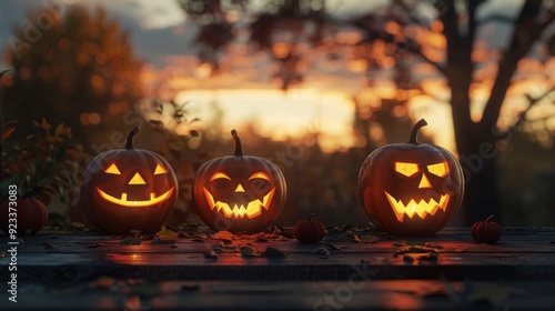 Three Jack-o'-lanterns of varying sizes are sitting on a wooden surface at sunset
