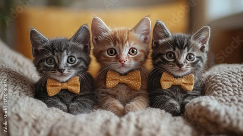 Three kittens, bow ties, cozy home, blurred background, pet adoption