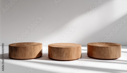 Three light brown wooden round podiums against a white background, bathed in natural light