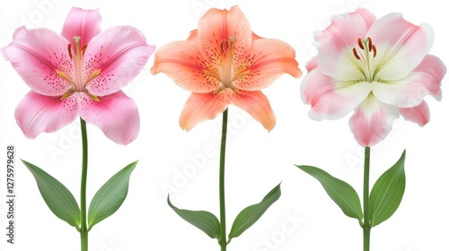 Three Lilies in Pink Orange and White with Green Stems on a White Background
