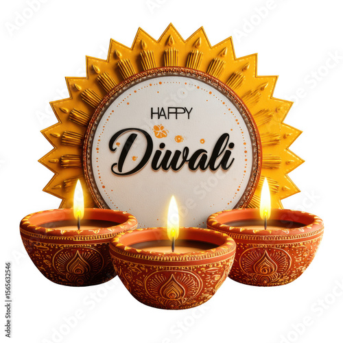 Three lit clay diyas with intricate designs and a golden sunburst decoration wishing happy diwali isolated on transparent background