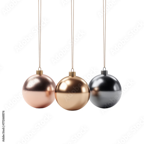 Three metallic Christmas ornaments hanging elegantly, symbolizing holiday spirit and decoration