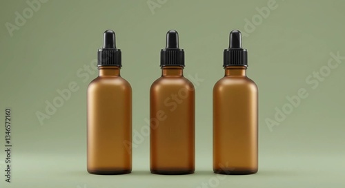 Three minimalistic amber colored bottles with frosted glass are presented on a simple light green background