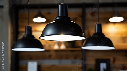 Three modern black ceiling lamps hang in room closeup Loft room interior Metal chandeliers in retro style on background wooden shelves with decor Dark room with Three modern lamps over : Generative AI