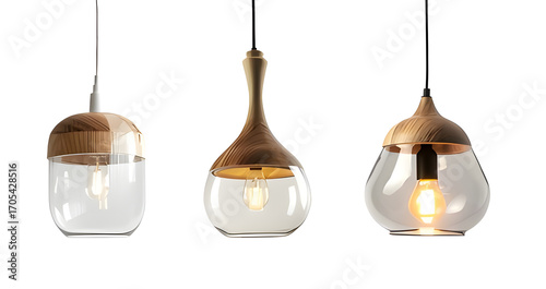 Three modern pendant lamps with wooden and glass shades isolated PNG with Transparent Background