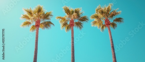 Three palm trees reaching for the sky against a vibrant blue sky.