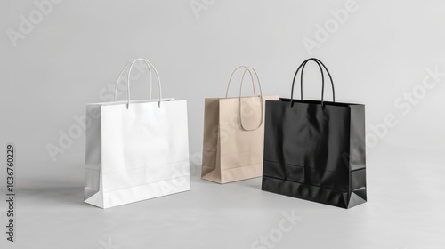 shopping, bag, paper, bag, white, brown, black, handle, gift, retail, store, market, purchase, product, commerce, business, present, carry, shop, sale, discount, delivery, package, cardboard box, tote, blank, empty, grey, background, studio, minimal, modern, simple
