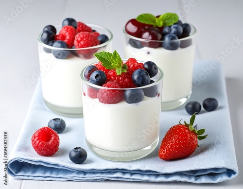 Three parfait glasses with yogurt and berries