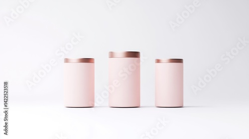 Three pastel pink cylindrical containers with gold rims arranged in a row on a white background, and minimalist composition for product display.