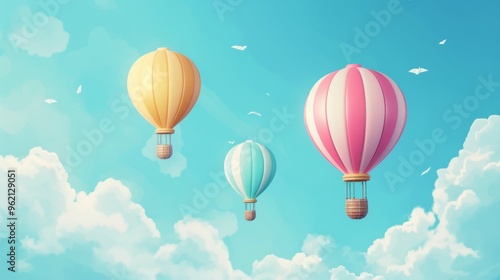 Three pastel-colored hot air balloons float peacefully in a clear blue sky with fluffy white clouds. The scene exudes tranquility and adventure, perfect for themes of travel, exploration, or dreamlike
