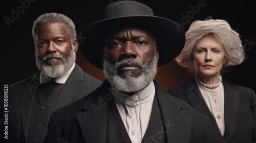 portrait, black-and-white, group, people, person, man, woman, serious, formal, attire, suit, coat, hat, beard, moustache, stare, vintage, old-fashioned, elegant, confident, studio, black background, dark, emotion, expression, professional, business, family, history, retro, nostalgia, heritage, generation, community, respect, strong, dignity, power, tradition, culture