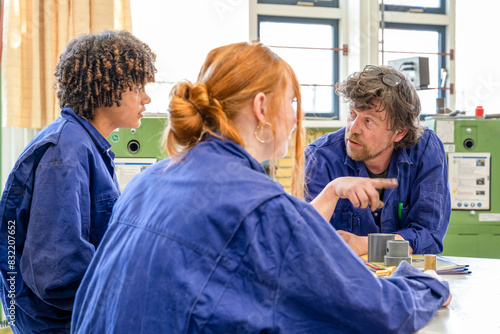 Three people wearing blue work coveralls are having a discussion in an industrial or workshop environment.