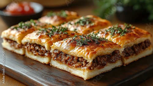 three pieces of traditional antakya kaytaz bo reg i featuring a soft dough base topped with a spiced ground meat mixture baked to golden perfection showcasing turkish culinary heritage