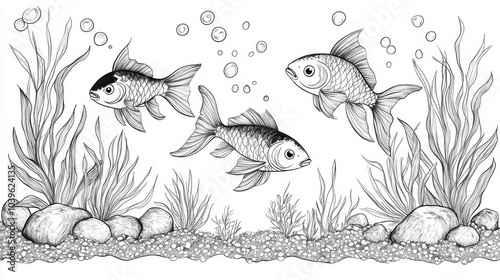 Three playful goldfish swimming amidst vibrant aquatic plants in an underwater garden setting, coloring page