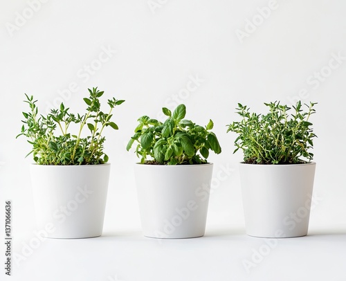 Three Potted Herbs Basil and Thyme in Minimalist Arrangement on White